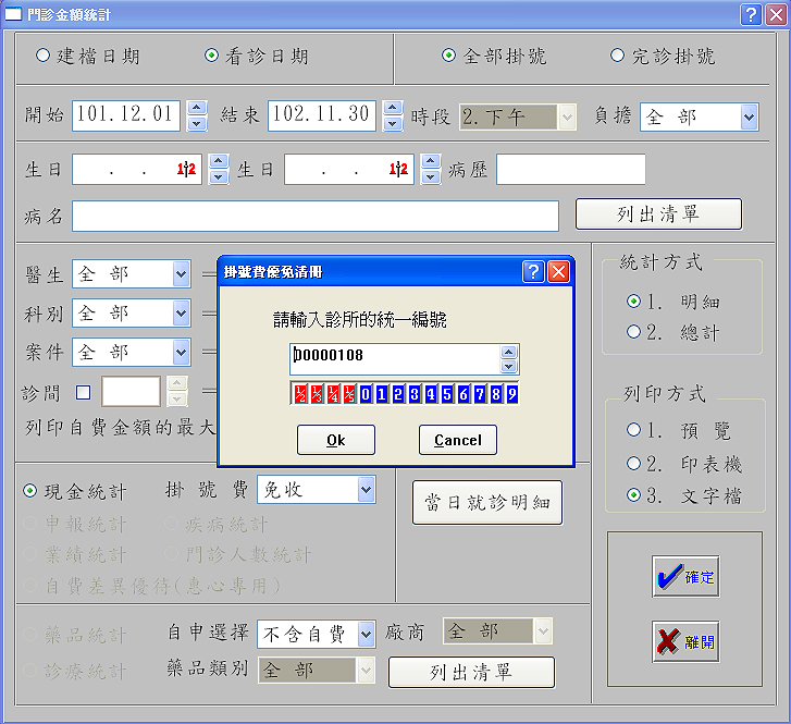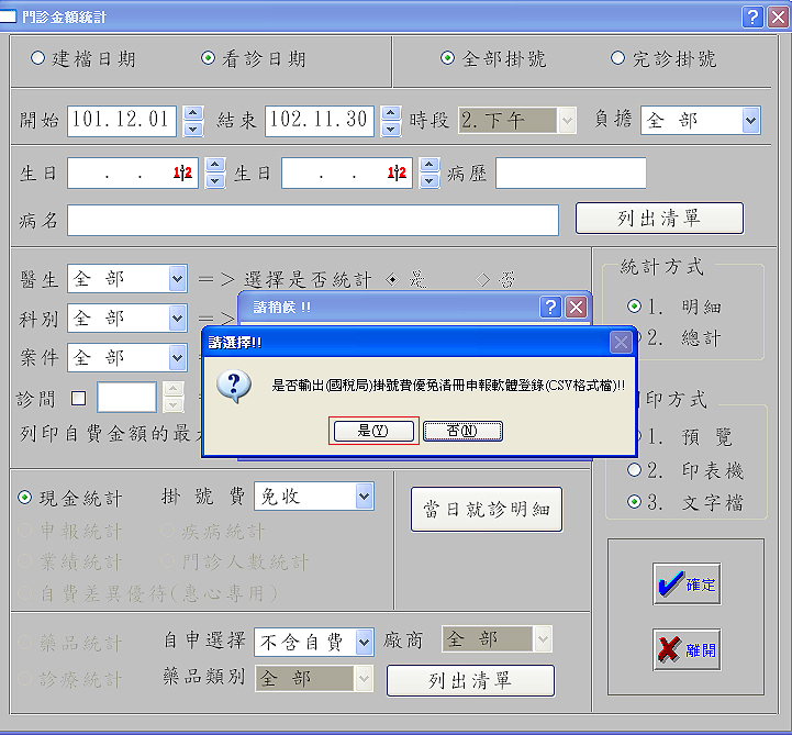 1. 請選擇要統計期間開始及結束日期,於下方『現金統計』右方掛號費選『免收』、『統計方式』點選「明細」、與『列印方式』點選「文字檔」後,再按下『確定』,出現詢問『是否輸出(國稅局)掛號費優免清冊申報軟體登錄(CSV格式檔)!!』再按下『是』。