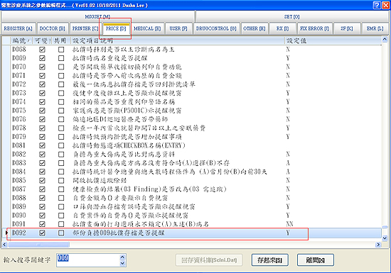 於『B院所資料』右下方點選『其他參數[O]』開啟參數編輯系統。於上方點選參數標籤「PRICE [D]」於下方尋找編號「D092 部份負擔009批價存檔是否提醒」,右方設定值請輸入『N』,再按下「存起來」「離開」即可。