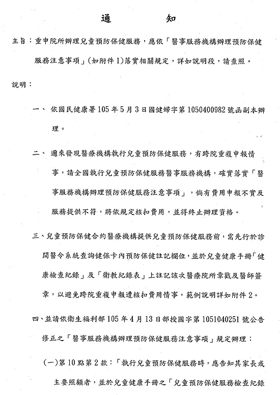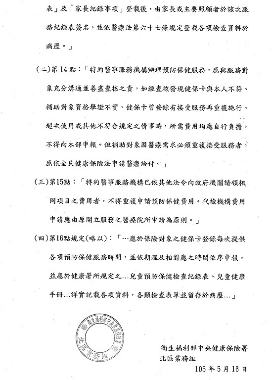 修正「醫事服務機構辦理預防保健服務注意事項」自105年5月1日生效