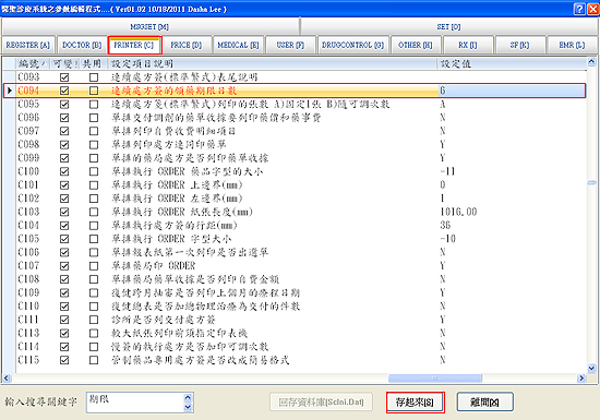 於醫聖主畫面『S系統工具>A系統參數設定』或於『B院所資料』右下方點選『其他參數[O]』開啟參數編輯系統。於上方點選參數標籤「PRINTER [C]」於下方尋找編號「C094 連續處方簽的領藥期限日數」,將右方設定值改為自定日數即可。