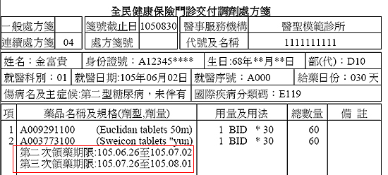 例如:105.06.02開立連處,其他參數建議領藥期限日數設為「6」,建議領藥期限列印結果如下圖。