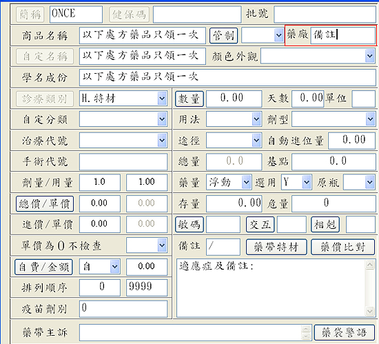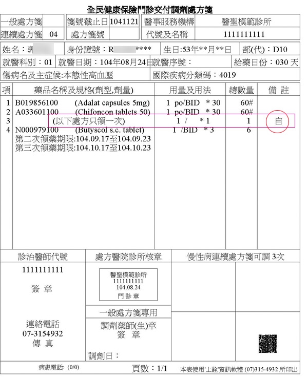連續處方箋若有列印『以下只領一次』的文字,在『備註欄』的位置是否不要印出『自』字樣,以免藥局誤以為以下為自費藥品