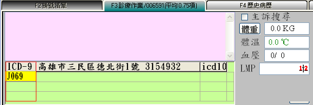 2、進入診療畫面於『ICD-9』欄位(下圖紅框處)即可直接鍵入ICD-10碼即可帶入病名資料。