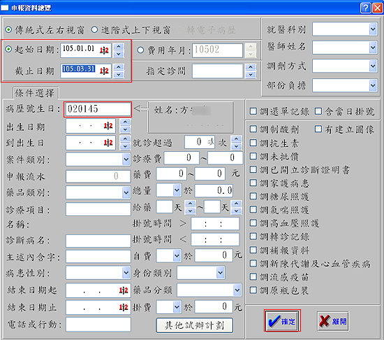 1. 於『A調閱病歷』或『9申報作業>7.調閱申報病歷』,輸入要調閱的起始及截止日期及病患基本資料後,按下「確定」。