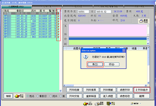 2. 調閱完成後,勾選要列印的看診病歷後,再按下「列印處方」,出現詢問「您選定了xxxx筆,確定要列印嗎」按「是」。