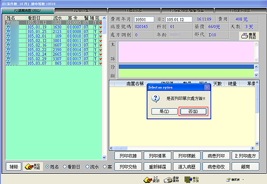 3. 出現詢問「是否列印單次處方」,按「否」即可將勾選列印的病歷處方印成A4紙張規格。