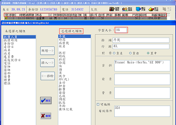 請按下電腦鍵盤『Ctrl』鍵不放,再於掛號清單畫面上方欄位抬頭名稱處(如下圖紅框處),用滑鼠左鍵快速連續點兩下,即可開啟如下圖設定畫面。於「字型大小」欄位設定數值即可加大或縮小字型,於「已選擇之欄位」處可增減要顯示於掛號清單畫面的項目內容。