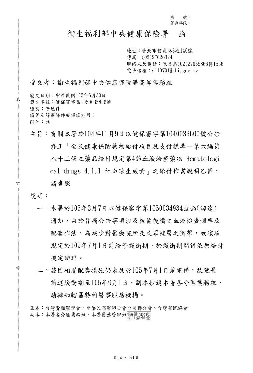 EPO藥品給付規定公告給予緩衝期原至105年7月1日延長至9月1日