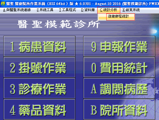 3. 主選單畫面上方的多工選單內,新增一項『C 統計分析』選單,選單內有項『復健療程統計』功能,也可以執行『PT療程次數』統計。【此處執行功能同『0費用統計』內的『復健療程統計』功能】