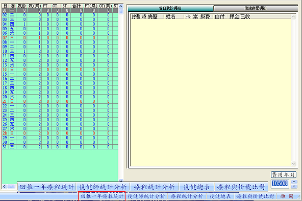 於上圖下方處按下『回推一年療程統計』鈕,即可顯示一年內復健治療超過200次病患資料,以便管控。