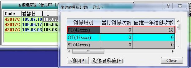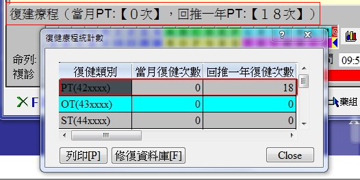 2. 在掛號編輯內的『復健療程畫面』與F3診療作業的『藥品處置畫面』,會自動顯示『PT療程次數』統計並提醒。【於『PT療程次數』統計次數列上按下滑鼠右鍵即可顯示如下圖統計視窗】