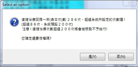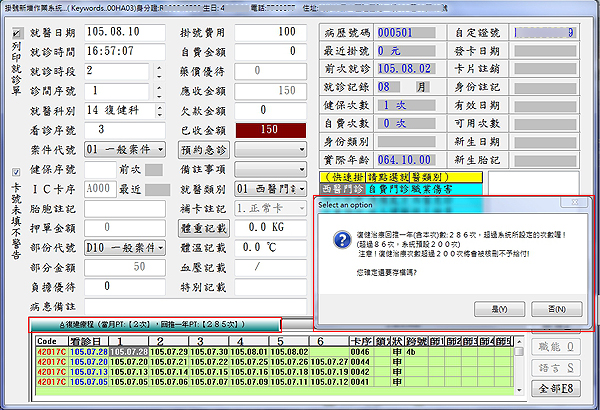 1. 設定在掛號與批價畫面做存檔時,執行『PT療程次數』合計超過『200次』病患的提醒功能!