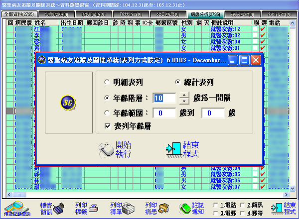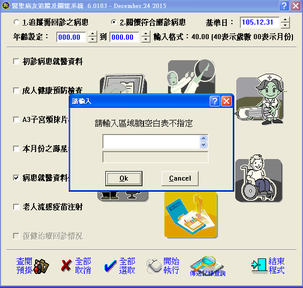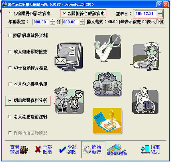 點選「2. 關懷符合應診病患」、設定調閱「基準日」、勾選「病患就醫資料分析」、再按下「開始執行」
