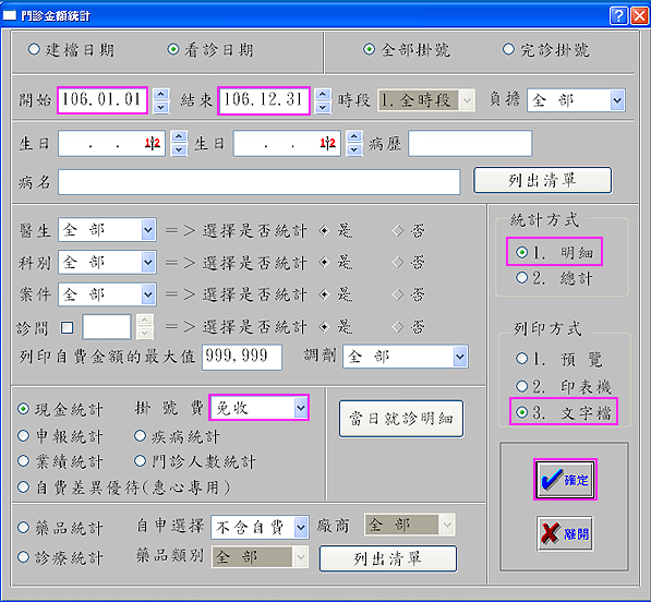 2.『統計方式』點選「明細」、『列印方式』點選「文字檔」後再按下『確定』