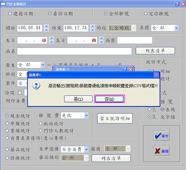 3. 出現詢問『是否輸出(國稅局)掛號費優免清冊申報軟體登錄(CSV格式檔)』,請按『否』