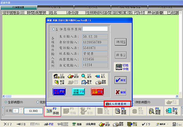 ●進入『2掛號作業』或『3診療作業』按下「掛號F2」,於開啟視窗下方新增『成人保健查詢』按鍵功能。