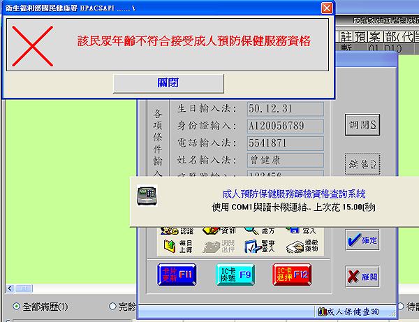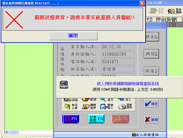 若未置入健保IC卡或用異常掛號時,系統無法執行自動查詢則會顯示如下訊息