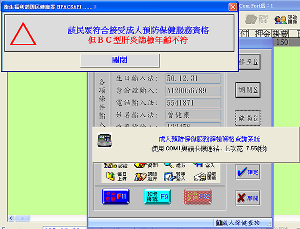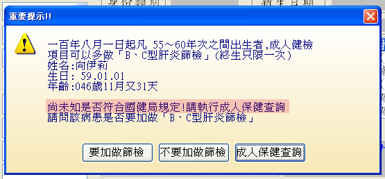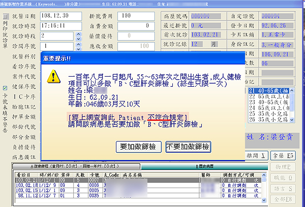 『掛號F2』視窗新增內建成人預防保健服務篩檢資格及是否已執行過BC型肝炎篩檢資格查詢功能