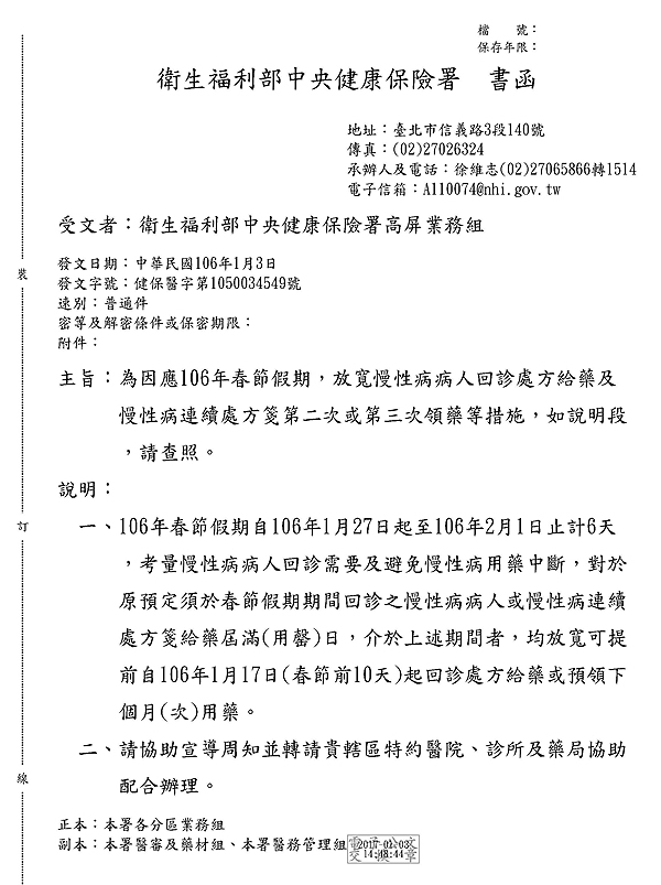 公告因應106年春節假期,放寬慢性病病人回診處方給藥及慢性病連續處方箋第二次或第三次領藥等措施