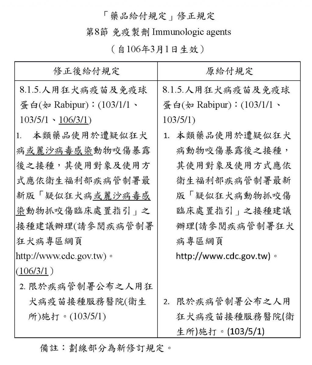 公告事項:修正「全民健康保險藥物給付項目及支付標準-第六編第八十三條之藥品給付規定第8節免疫製劑Immunologic agents 8.1.5.人用狂犬病疫苗及免疫球蛋白(如Rabipur)」部分規定,給付規定修正對照表如附件。(附件電子檔已置於本署全球資訊網(http://www.nhi.gov.tw),路徑為:首頁>公告,請自行下載)。