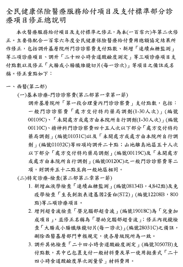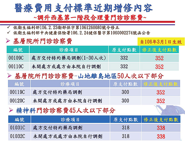 發布修正「全民健康保險醫療服務給付項目及支付標準」部分診療項目【門診診察費】,並自民國106年3月1日生效