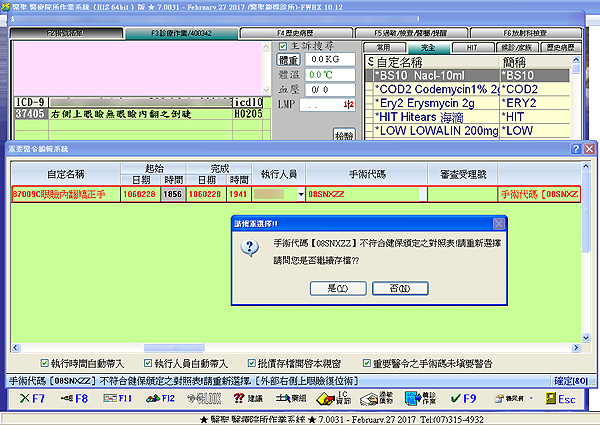 ↓手術代碼比對是依健保署公告對照表,因此若出現與醫令對應不同之代碼時,會出現如上圖視窗,