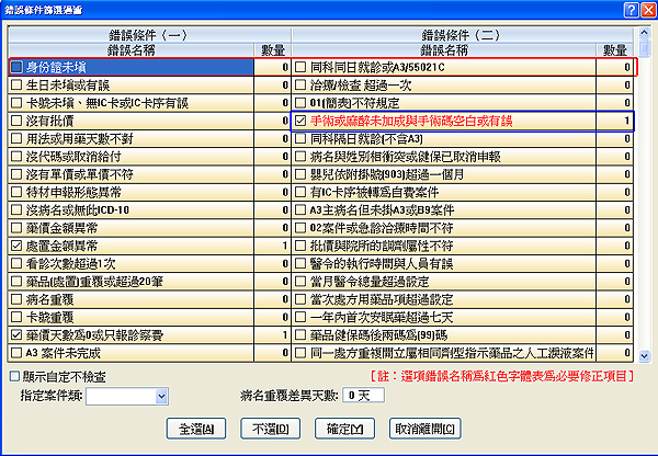 按下『篩選錯誤』,可單獨勾選『手術或麻醉未加成與手術碼空白或有誤』項目,