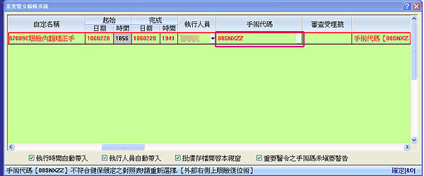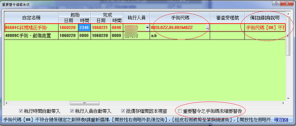 3. 新增『重要醫令之手術碼未填要警告』勾選項目,預設都會出現警告視窗!