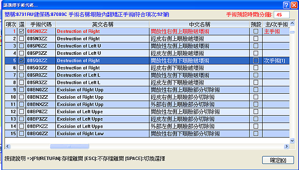 依勾選順序,右方會顯示為主手術及次手術代碼,可選擇多項,