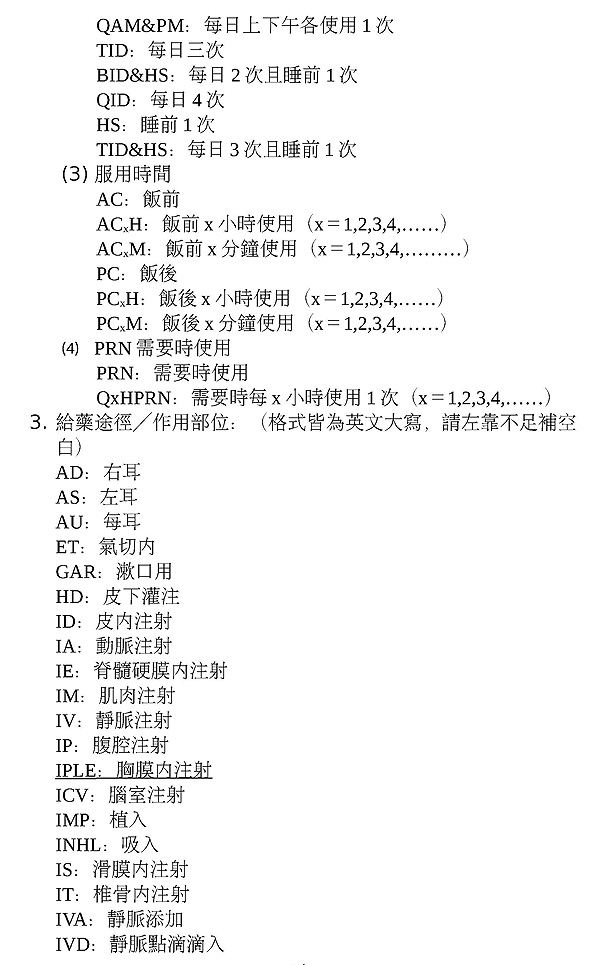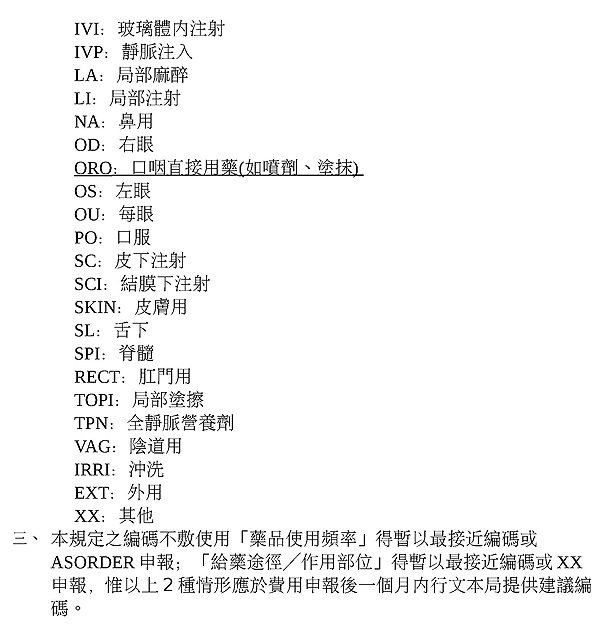 說明:配合醫療院所來函建議及徵詢相關單位意見後,於「給藥途徑/作用部位」中,新增ORO【口咽直接用藥(如噴劑、塗抹)】及IPLE【胸膜內注射】,詳附件劃底線段。