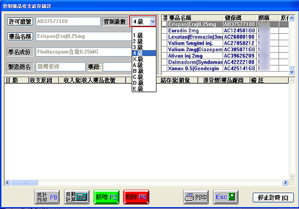 開啟『管制藥品收支結存統計』系統,在「管制級數」點選要統計級數,例如4級