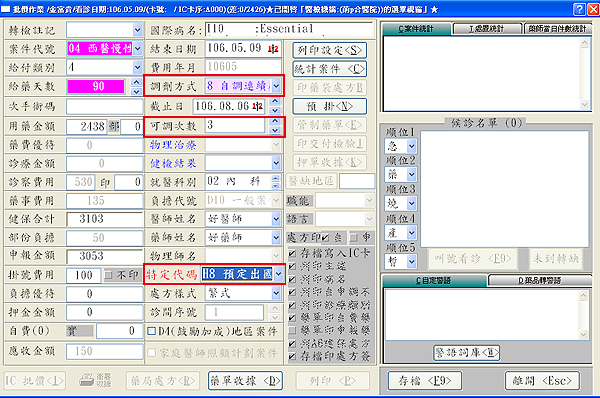 【一次領取三個月】確認「給藥天數」為90日、調劑方式為「8.自調連續處方」、可調次數為「3」次、臥病遠洋欄位類別為「H8預訂出國」,確認無誤按下「F9存檔」完成批價存檔。