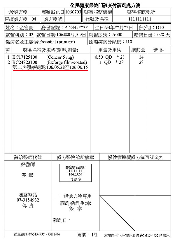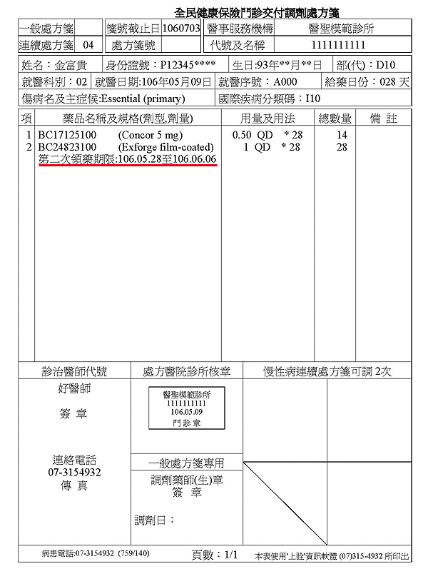 說明:開立日106/05/09、給藥28日、可領2次、第1次領藥用迄日106/06/05、第2次領藥起日106/06/06