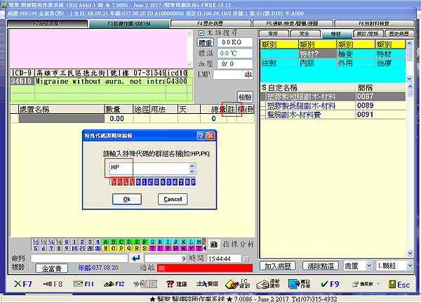 於『F3診療作業診』畫面,在「部位」或「註」抬頭名稱上,用滑鼠左鍵連續點兩下,