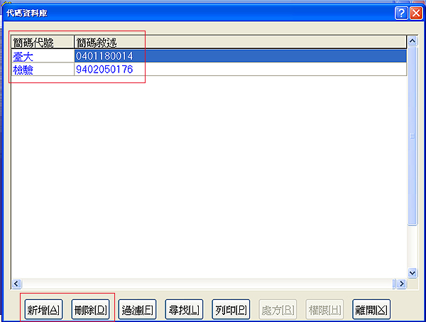 即可開啟「特殊代碼調閱與編輯的群組名稱」視窗,請於空白欄內 輸入「HP」後,