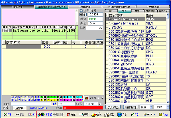 1. 於『F3診療作業』畫面看診時發現無相關申報支付代碼時,可直接於下方工具列按下『F12』進入藥品新增畫面