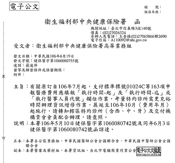 原訂自費用年月106年7月起,增列填報執行起迄時間及醫事人員代號之醫令項目公告展延至106年10月起施行