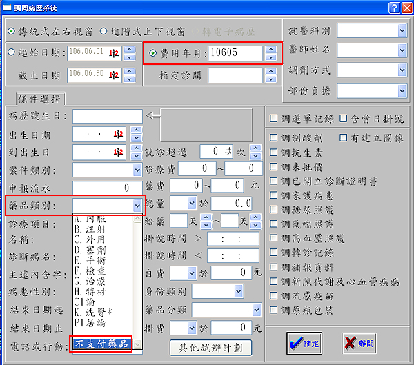 2. 於『藥品類別』下拉式選單,點選「不支付藥品」,再按下「確定」