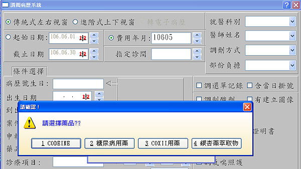 3. 出現請選擇藥品「1 CODEINE」「2 糖尿病用藥」「3 COXII用藥」「4 銀杏藥萃取物」選單
