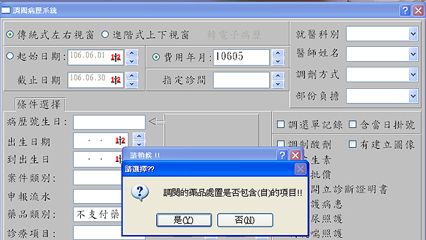 4. 詢問「調閱的藥品處置是否包含(自)的項目」,若以健保申報案件為主,請按下「否」,即可調出相關案件查閱。