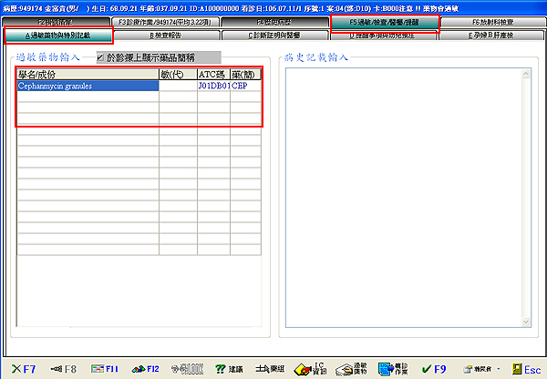 於看診畫面,點選「F5 過敏/檢杳/醫囑/提醒」,再點選「A 過敏藥物與特別記載」
