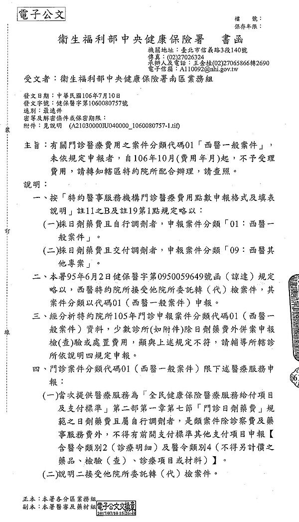 公告有關門診醫療費用之案件分類01「西醫一般案件」未依規定申報者自費用年月106年10月起不予受理費用