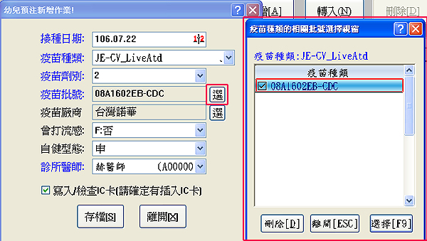滑鼠左鍵點選『疫苗批號』與『疫苗廠商』右方『選』功能鈕,可以做選擇與刪除作業