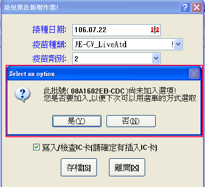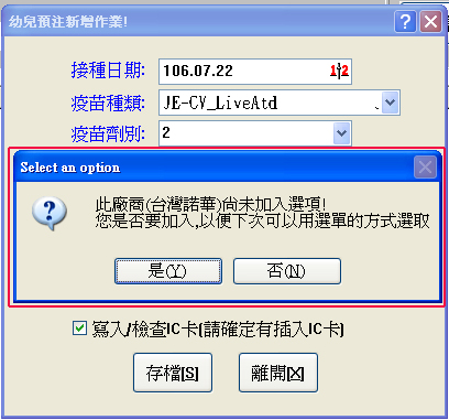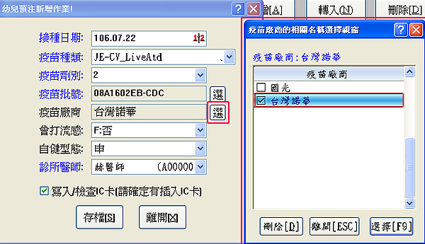 新的輸入視窗內『疫苗批號』與『疫苗廠商』右方有一個『選』功能鈕,可以做選擇與刪除!