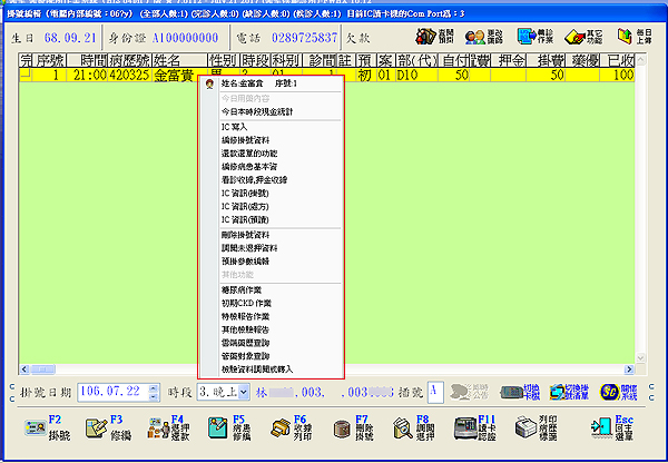 於『2掛號作業』掛號清單列表畫面,按滑鼠右鍵即可開啟掛號多功能快捷選單