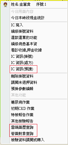 掛號作業多功能快捷選單新增可直接使用『雲端藥歷』『管制藥品保險對象名單』『預讀IC卡』查詢功能選項