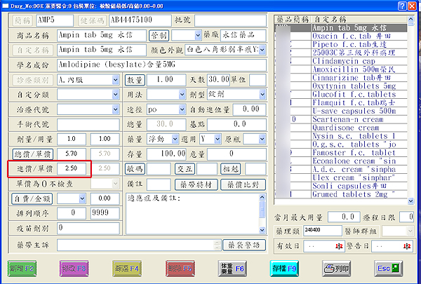1. 先於『4藥品資料』找到欲設定統計藥品資料後,按『F3修改』於『進價/單價』欄位輸入成本後按『F9存檔』。