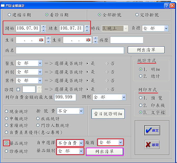 2. 於『0費用統計』選擇「開始」「結束」日期後,於最下方點選『藥品統計』/『自申選擇』點選下拉式選單,可選擇全部或健保藥、自費藥...等;亦可搭配 選擇「廠商」 、 「藥品類別」如內服 、外用 、注射 ...等等特定條件需求;於『統計方式』可點選明細或總計,於『列印方式』可直接輸出文字檔查看或使用EXCEL編輯再利用;設定好所有條件後,按下『確定』便會看到用量、成本、利潤等資料。