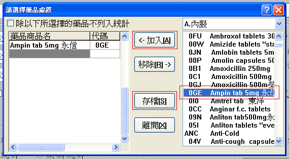 於右邊點選要「加入」統計藥品,再按下「存檔」離開即可。