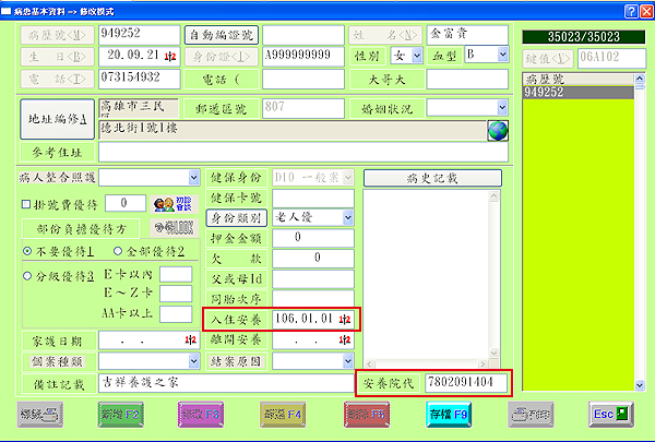 註:輸入完成的安養院代及入住安養資料會自動回存至該病患資料如下圖欄位內【用戶亦可於此處輸入】